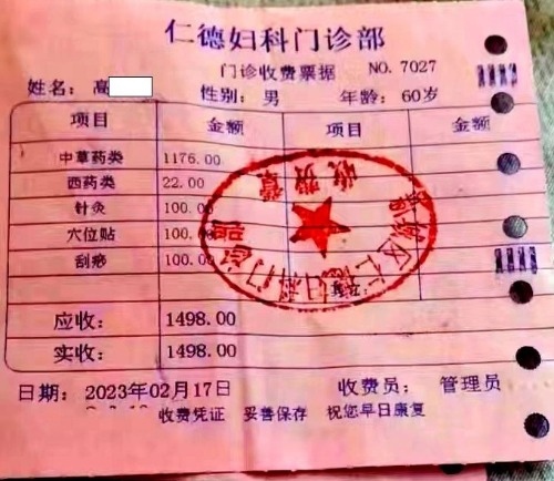高先生被說動了,在王女士的陪同下來到了這名男子口中的“仁德醫(yī)院”。進去以后,發(fā)現(xiàn)醫(yī)院的名字叫“仁德婦科門診”。醫(yī)生確實如男子所說的那樣,告訴高先生不用做手術,給開了1498元的中藥和中醫(yī)治療項目(如圖)。