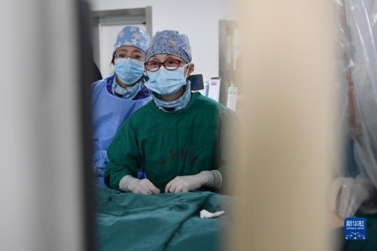3月7日,馬娜(左)和同事在手術(shù)室為患者進(jìn)行介入手術(shù)治療。