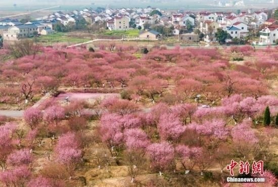 3月9日,江蘇南京,郊外盛開的梅花接連成片,呈現(xiàn)“粉色海洋”。(無人機(jī)照片)中新社記者 泱波 攝