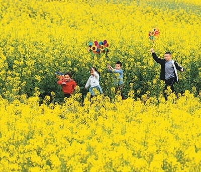 2022年,四川省眉山市仁壽縣謝安鎮(zhèn)扎林村對(duì)1200畝撂荒地集中整治,通過(guò)集體經(jīng)濟(jì)聯(lián)合社進(jìn)行統(tǒng)一種植、統(tǒng)一管理,既盤(pán)活了閑置土地、讓村民變股民,又讓荒山成景點(diǎn)。圖為3月5日,兒童在扎林村油菜花地里玩耍。 潘 帥攝(人民視覺(jué))