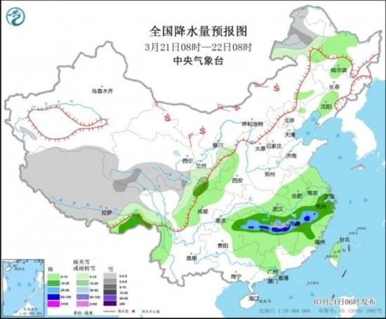3月21日08時至22日08時,內(nèi)蒙古東北部、西藏大部、青海南部、甘肅東南部等地部分地區(qū)有小到中雪。西藏東南部、江南中北部等地部分地區(qū)有中到大雨,其中,湖南中西部、江西中北部等地部分地區(qū)有暴雨或大暴雨(100~120毫米)。內(nèi)蒙古中部、西北地區(qū)中部等地部分地區(qū)有4~6級風(fēng),其中,內(nèi)蒙古西北部部分地區(qū)有6~7級風(fēng),并伴有沙塵天氣。