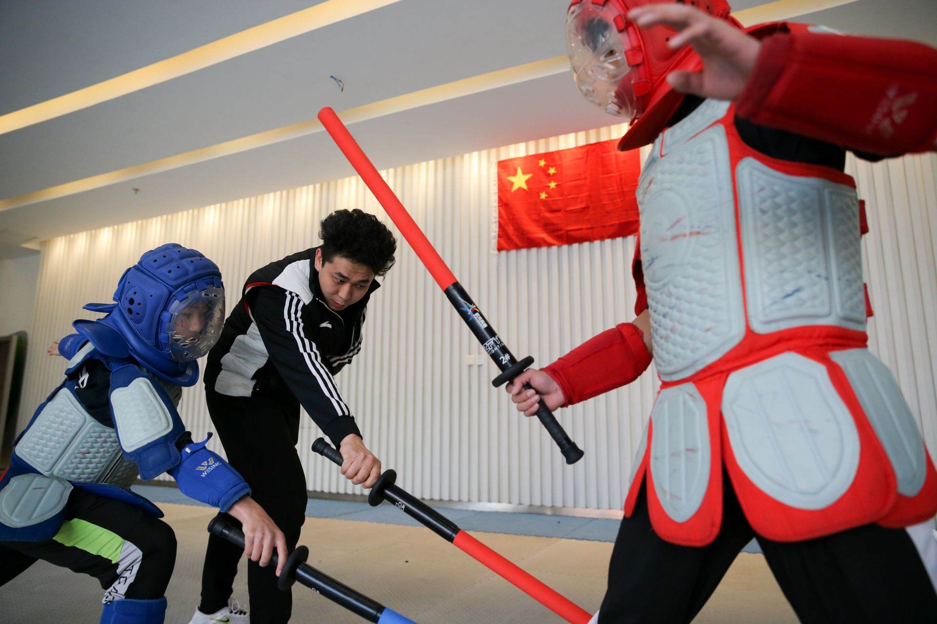 據(jù)了解,2021年,國家體育總局武術(shù)管理中心推出了試行的武術(shù)兵道(短兵)競賽規(guī)則,武術(shù)兵道作為與武術(shù)套路、武術(shù)散打并列的競技武術(shù)重要內(nèi)容在全國普及推廣。同一年,剛剛從北京體育大學(xué)武術(shù)專業(yè)畢業(yè)的張宇來到呼和浩特,參與了內(nèi)蒙古第一批武術(shù)兵道運動員的選拔?!耙驗槭切马椖?,大部分隊員都是跨項選拔,主要關(guān)注他們的身體靈活性和臂展?!睆堄钫f。