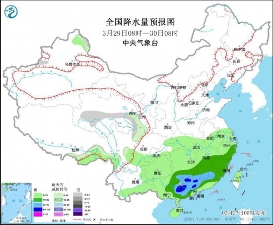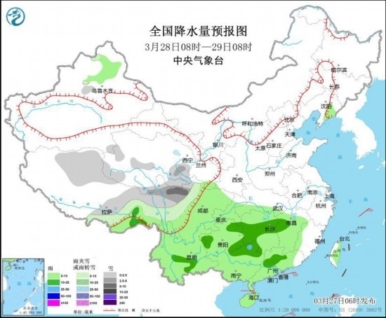 3月28日08時(shí)至29日08時(shí),西藏北部和東部、青海東部、川西高原中北部等地部分地區(qū)有小雪或雨夾雪,其中,西藏東北部、川西高原北部等地部分地區(qū)有中到大雪。西藏東南部、江南大部、西南地區(qū)大部、華南等地部分地區(qū)有小到中雨,局地有大雨(見圖2)。