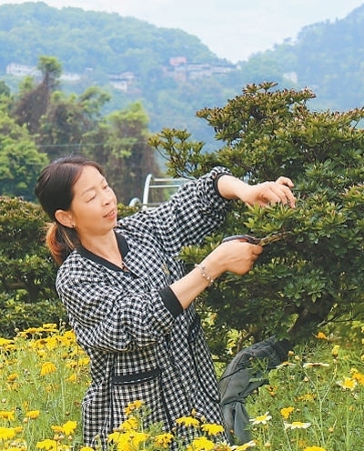 村民在自家苗圃修剪盆景。