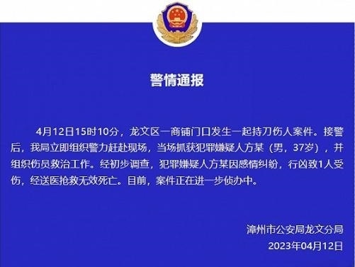 ·漳州公安通報萬達(dá)砍人案:男子因感情糾紛行兇致一人死亡,被當(dāng)場抓獲。