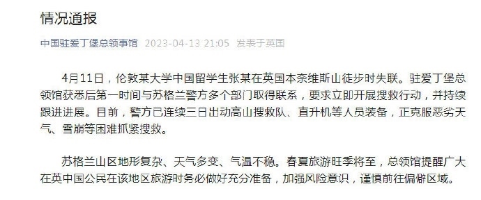 ·一名中國留學(xué)生在英國徒步時失聯(lián),中領(lǐng)館:已聯(lián)系警方,正抓緊搜救。