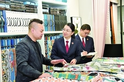 浙江省紹興市柯橋區(qū)被稱為“國(guó)際紡都”。2022年,柯橋區(qū)人民檢察院通過大數(shù)據(jù)監(jiān)督模型,監(jiān)督糾正62件花樣著作權(quán)虛假訴訟案件,入選2022年知識(shí)產(chǎn)權(quán)檢察十大案事例。圖為辦案人員在走訪商戶??聵騾^(qū)人民檢察院供圖
