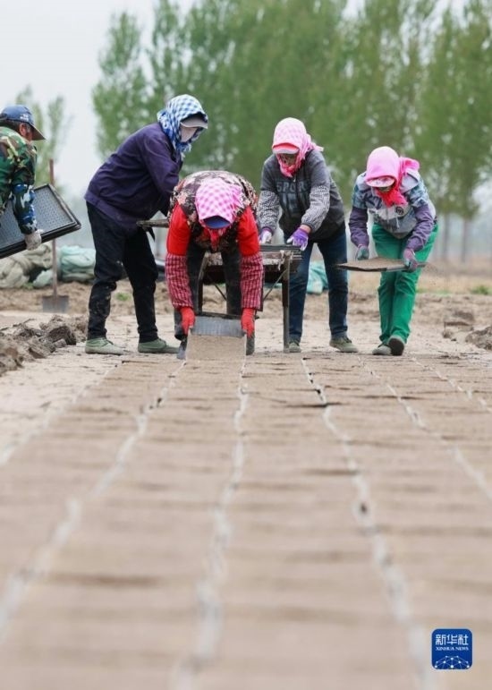 4月18日,唐山市豐南區(qū)西葛鎮(zhèn)的農(nóng)民在田間擺放育秧盤。
