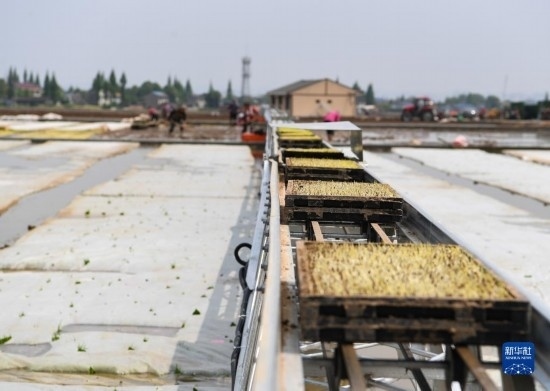 4月20日,在彭山區(qū)公義鎮(zhèn)的數(shù)智水稻示范基地,秧盤智能傳輸帶運送育秧盤。