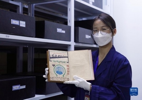 4月28日,在上海市檔案館的保護(hù)技術(shù)部,檔案修復(fù)師任翹楚利用專業(yè)設(shè)備對檔案進(jìn)行展平處理。