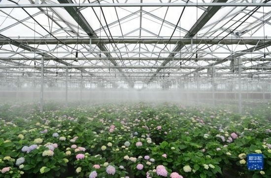 5月5日,在肥西縣經(jīng)開區(qū)一家農(nóng)林科技企業(yè),員工在花卉種植基地打理繡球花。