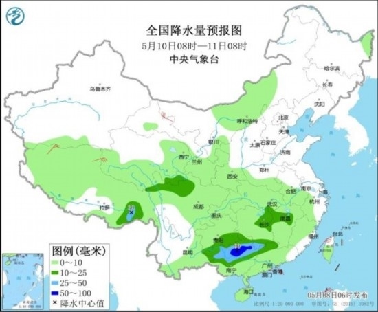 5月10日08時至11日08時,甘肅南部、青海南部、西藏北部等地部分地區(qū)有小到中雪或雨夾雪,部分地區(qū)有大到暴雪;湖南中南部、江西中北部、西南地區(qū)東南部、華南北部和西部等地部分地區(qū)有中到大雨,其中,廣西北部等地部分地區(qū)有暴雨(50~90毫米)。西藏北部和西部、甘肅河西等地部分地區(qū)有4~6級風(fēng)。
