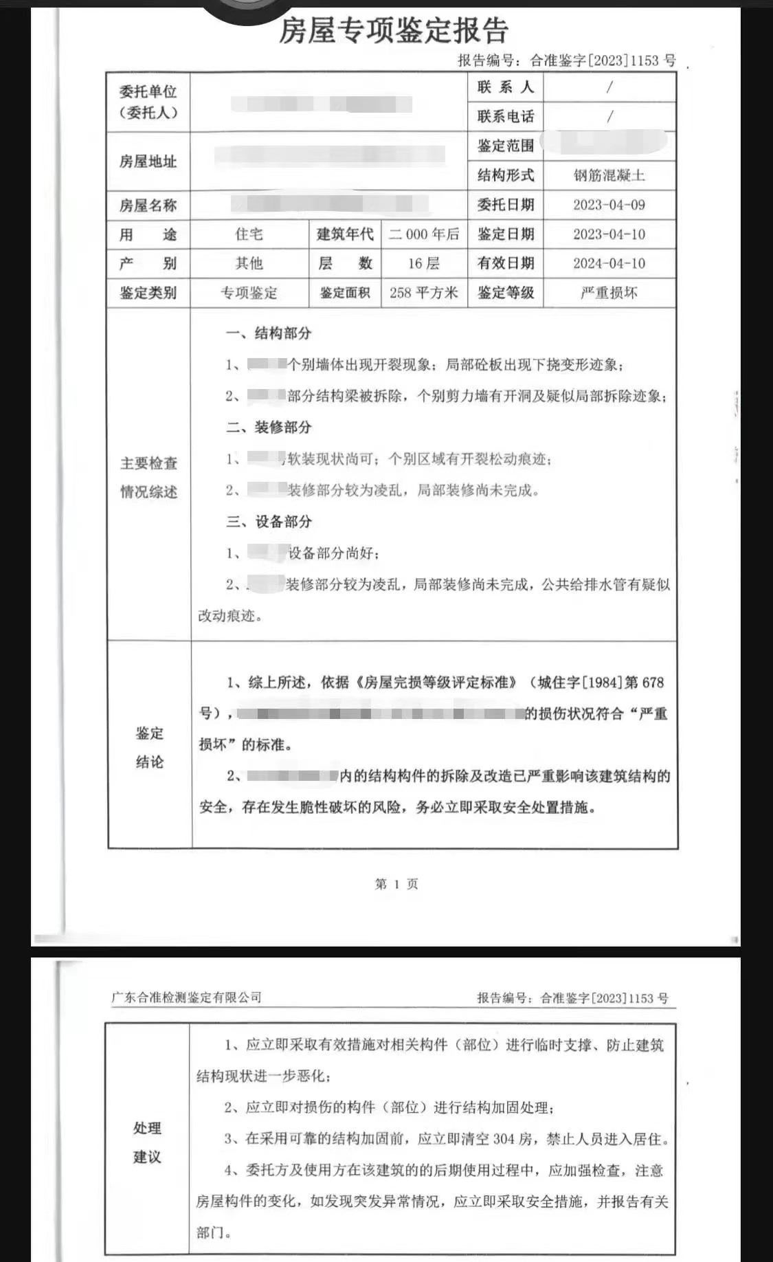 值得注意的是,發(fā)現(xiàn)204房的承重墻被拆后,有業(yè)主曾自費(fèi)請(qǐng)鑒定機(jī)構(gòu)對(duì)204房、304房進(jìn)行安全鑒定。鑒定結(jié)果顯示,涉事房屋的損傷程度符合“嚴(yán)重?fù)p壞”的標(biāo)準(zhǔn);在采用可靠的結(jié)構(gòu)加固前,應(yīng)立即清空304房,禁止人員進(jìn)入居住。而在5月5日,永平街道辦在涉事樓棟貼出“致廣大居民朋友的一封信”,其中提到:4月8日至18日,已經(jīng)完成了臨時(shí)加固支撐工程,目前建筑物整體結(jié)構(gòu)穩(wěn)定可控,人員無需轉(zhuǎn)移,但需要盡快加固補(bǔ)強(qiáng)。