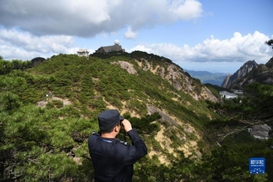 4月20日,秦志平在黃山風(fēng)景區(qū)觀測山林。