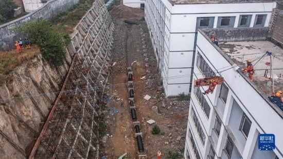 六盤(pán)水消防救援支隊(duì)隊(duì)員在打鉆孔(5月11日攝)。