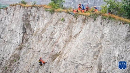 六盤(pán)水消防救援支隊(duì)隊(duì)員在進(jìn)行模擬高山峽谷救援演練(5月11日攝,無(wú)人機(jī)照片)。