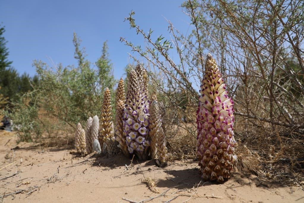 記者在四翅濱藜肉蓯蓉試種基地看到,一株株四翅濱藜綠意盈盈,在其根部生長的一排排肉蓯蓉破土而出,一株最多長出40多株肉蓯蓉,五顏六色的肉蓯蓉花競相開放,成為一道美麗的風(fēng)景。
