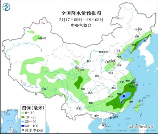 全國降水量預報圖(5月16日08時-17日08時)。圖片來源:中央氣象臺網(wǎng)站