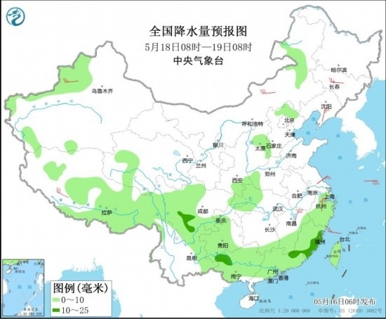 5月18日08時至19日08時,新疆沿天山地區(qū)和伊犁河谷、西藏南部和東部、川西高原、內蒙古東北部、青海西部、山西中部、河北北部、西南地區(qū)東南部、江漢西部、江南中東部和南部、華南大部等地的部分地區(qū)有小到中雨。新疆北部、西藏南部、內蒙古中部、吉林中部、遼東半島、江西北部、浙江北部等地的部分地區(qū)有4~6級風。