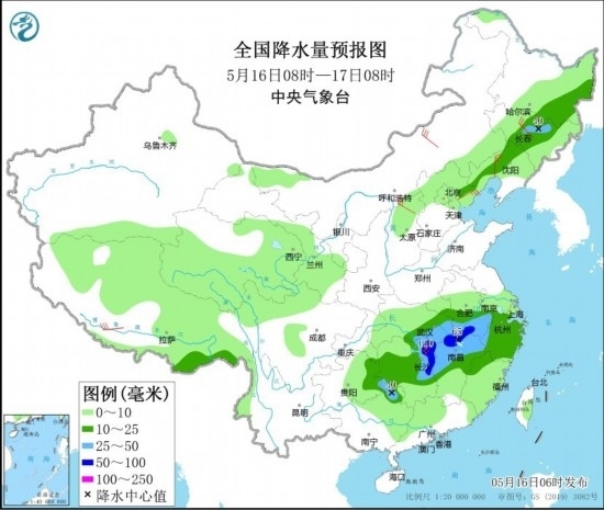 5月16日08時至17日08時,黑龍江東南部、吉林中東部、遼寧北部和西部、江漢東南部、江淮西南部、江南大部等地的部分地區(qū)有中到大雨,其中,湖北東南部、安徽南部、湖南東北部、江西北部等地局地有暴雨或大暴雨(100~110毫米)。西藏南部、內蒙古中東部、吉林中部、遼寧西部、山西北部、河北東北部等地的部分地區(qū)有4~6級風。