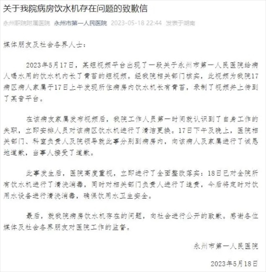 ·永州第一人民醫(yī)院致歉病房飲水機長青苔:追責相關(guān)部門負責人。
