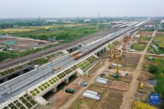 5月20日,在滬寧沿江高鐵太倉(cāng)站施工現(xiàn)場(chǎng),中鐵十二局的工程人員利用機(jī)械將鋼軌放入承軌槽(無(wú)人機(jī)照片)。