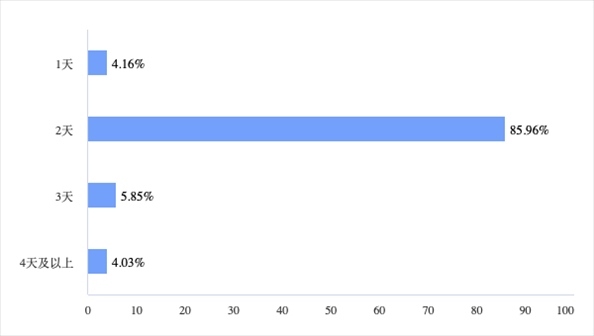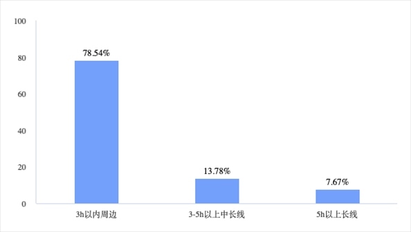 在出游時間和距離方面,短途游是大部分“特種兵旅游”人群的選擇。第一財經(jīng)調(diào)查結(jié)果顯示,86.09%的受訪者選擇周五晚上出發(fā),78.54%的受訪者選擇3小時路程的周邊游目的地,85.96%的受訪者選擇2天游程時間。