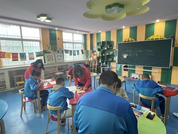 在美工課堂上,記者看到一位“90后”女教師正指導(dǎo)學(xué)生做手工。張偉說(shuō),這位老師叫劉若晨,是一名聽(tīng)力障礙人士。因?yàn)閷?duì)殘疾兒童感同身受,在大學(xué)畢業(yè)后,她參加了招教考試,來(lái)到渭南市特殊教育學(xué)校工作。