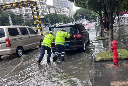 2023年5月22日,廣西桂林,受暴雨影響,城市道路積水嚴(yán)重,交警在積水中合力手推一輛拋錨的汽車。廣西桂林交警 圖