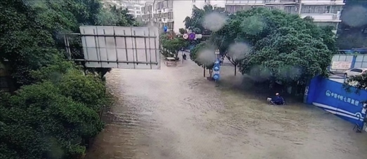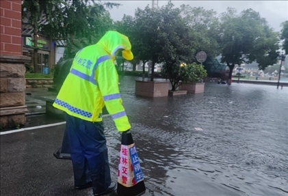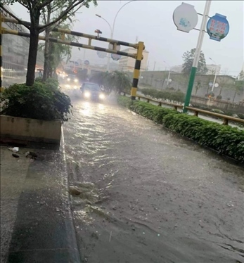 暴雨過(guò)后,城市道路積水嚴(yán)重,城區(qū)出現(xiàn)內(nèi)澇,市民蹚水出行。