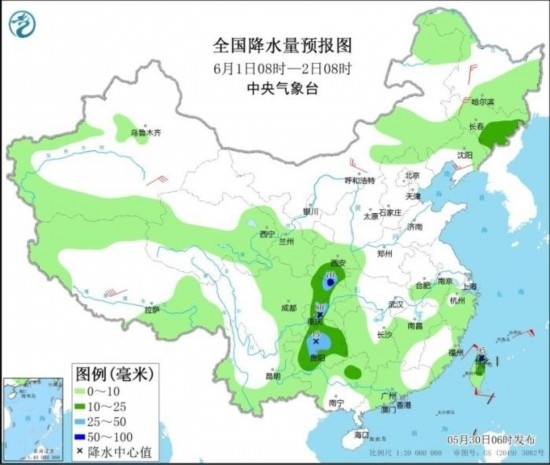 全國降水量預(yù)報圖(5月30日08時-31日08時)