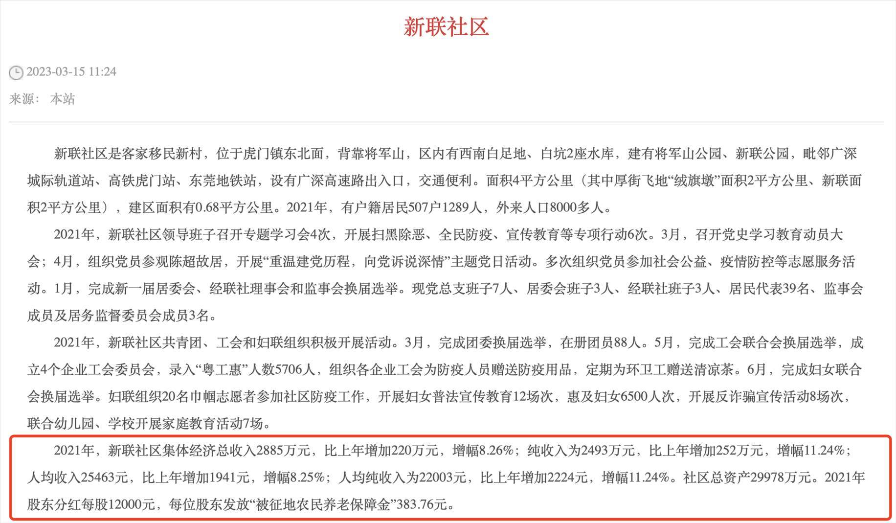 官網(wǎng)信息表明,2021年,新聯(lián)社區(qū)集體經(jīng)濟(jì)總收入已達(dá)到2885萬元,比上年增加220萬元,增幅8.26%;純收入為2493萬元,比上年增加252萬元,增幅11.24%。