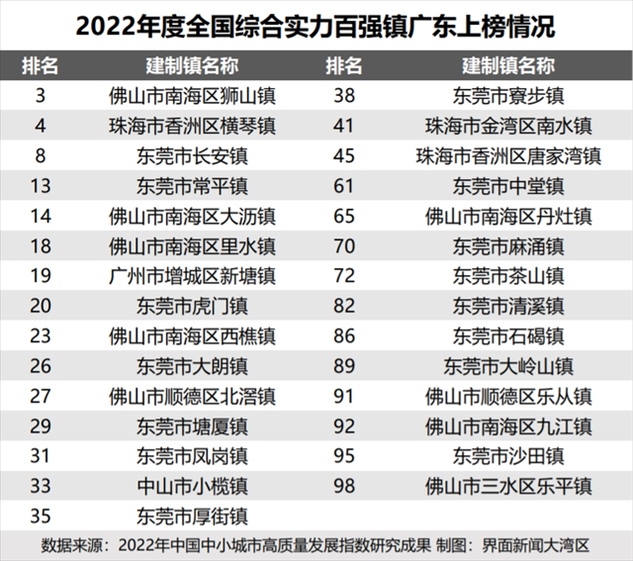 中國中小城市發(fā)展指數(shù)研究課題組、國信中小城市指數(shù)研究院去年發(fā)布的《2022年中國中小城市高質(zhì)量發(fā)展指數(shù)研究成果》顯示,在全國百強(qiáng)鎮(zhèn)名單中,廣東共有29個(gè)鎮(zhèn)上榜。其中,東莞虎門鎮(zhèn)位列全國第20名。