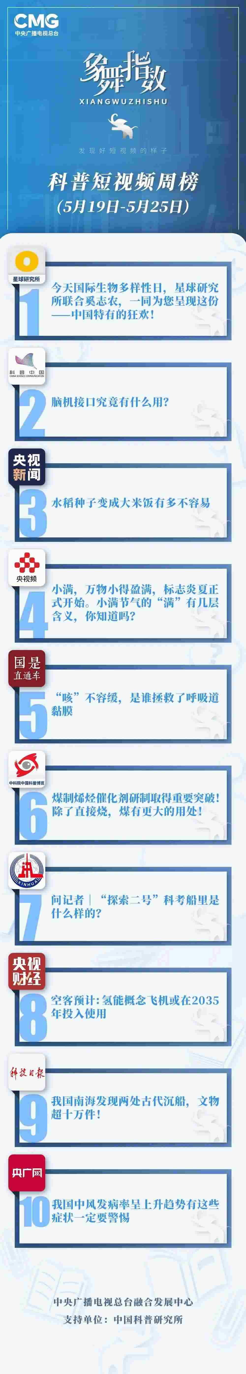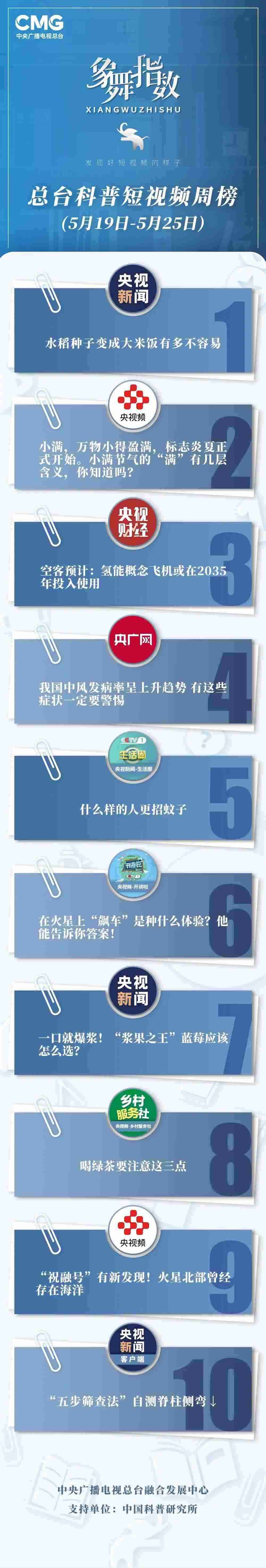 中央廣播電視總臺(tái)“象舞指數(shù)”評(píng)議品牌,推出科普短視頻周榜、總臺(tái)科普短視頻周榜。在2023年5月19日-5月25日,值得注目的內(nèi)容有: