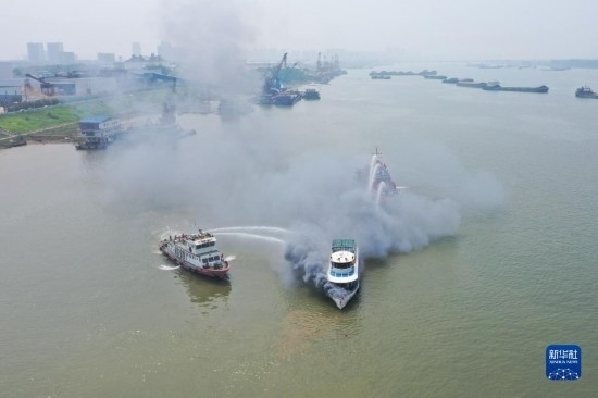 6月2日,在水域救援實戰(zhàn)演習(xí)現(xiàn)場,消防救援人員駕駛消防艇在模擬水上滅火行動(無人機(jī)照片)。