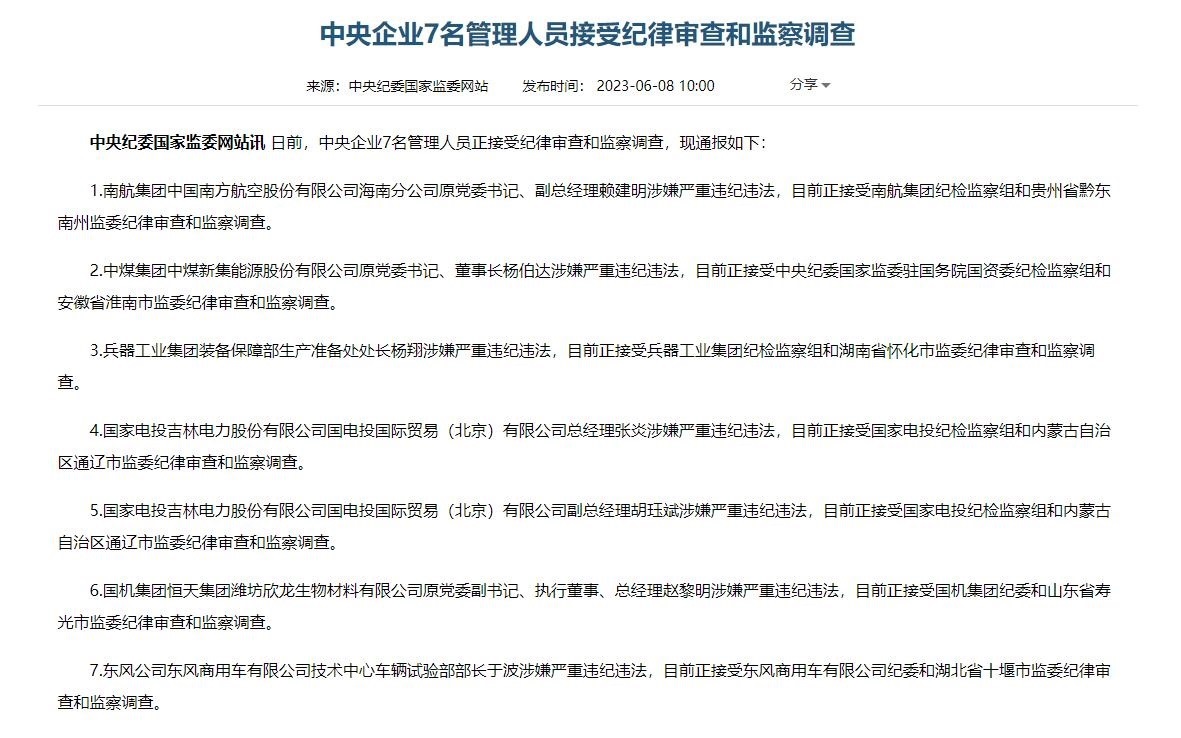 ·中央企業(yè)7名管理人員接受紀(jì)律審查和監(jiān)察調(diào)查。