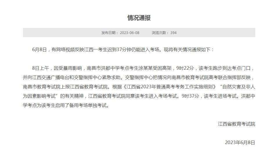 ·江西省教育考試院通報(bào)“一考生遲到37分鐘仍能進(jìn)入考場”。