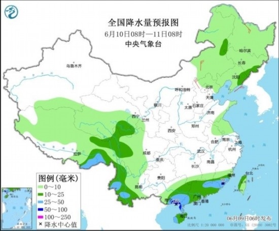 圖2 全國(guó)降水量預(yù)報(bào)圖(6月9日08時(shí)-10日08時(shí))