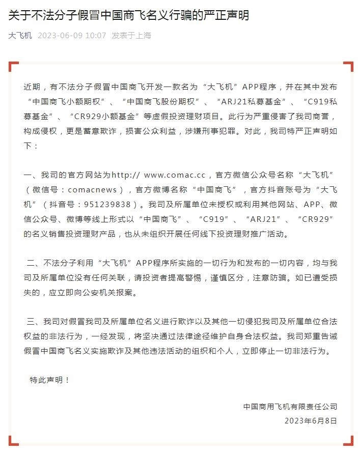 另?yè)?jù)“大飛機(jī)”微信公眾號(hào)6月9日發(fā)布的《關(guān)于不法分子假冒中國(guó)商飛名義行騙的嚴(yán)正聲明》,有不法分子假冒中國(guó)商飛開(kāi)發(fā)一款名為“大飛機(jī)”APP程序,并在其中發(fā)布“中國(guó)商飛小額期權(quán)”、“中國(guó)商飛股份期權(quán)”、“ARJ21私募基金”、“C919私募基金”、“CR929小額基金”等虛假投資理財(cái)項(xiàng)目。