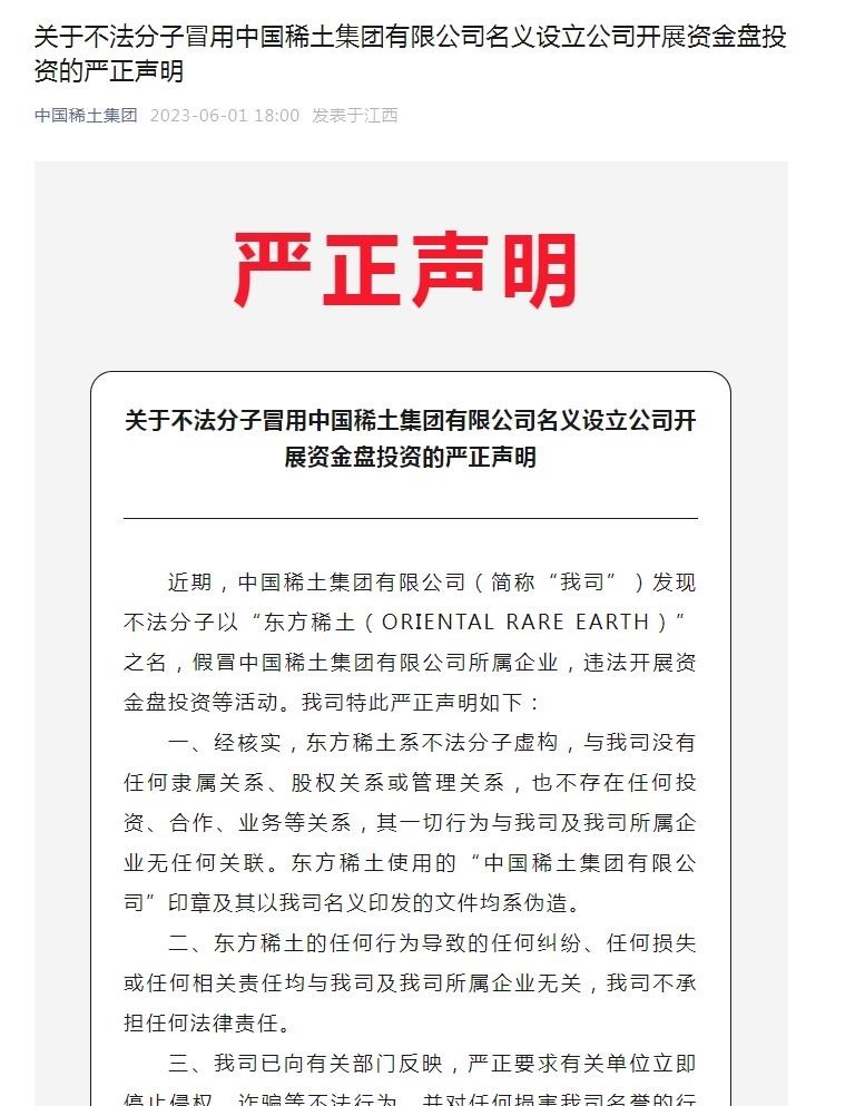 “中國(guó)稀土集團(tuán)”微信公眾號(hào)曾在6月1日發(fā)布嚴(yán)正聲明提醒,近期,中國(guó)稀土集團(tuán)有限公司(下稱(chēng)“中國(guó)稀土”)發(fā)現(xiàn)不法分子以“東方稀土(ORIENTAL RARE EARTH)”之名,假冒中國(guó)稀土集團(tuán)有限公司所屬企業(yè),違法開(kāi)展資金盤(pán)投資等活動(dòng)。