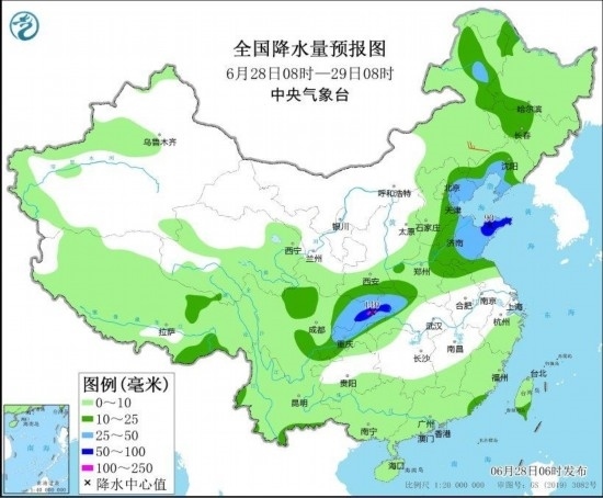 預(yù)計,6月28日08時至29日08時,遼東半島、北京東部、天津北部、河北東北部、山東中東部、四川東部、陜西南部、重慶大部、湖北西部等地部分地區(qū)有大到暴雨,其中,重慶北部局地有大暴雨(100~140毫米)。上述部分地區(qū)伴有短時強降水(最大小時降雨量30~50毫米,局地可超過60毫米),內(nèi)蒙古東北部、黑龍江西南部、吉林中西部、遼寧南部、陜西東南部、河北東部、北京東部、天津、山東北部和東部、安徽北部、江蘇北部等地的部分地區(qū)將有8~10級雷暴大風或冰雹天氣,局地風力可達11級(見圖1和圖2)。中央氣象臺6月28日06時繼續(xù)發(fā)布暴雨藍色預(yù)警和強對流天氣藍色預(yù)警。