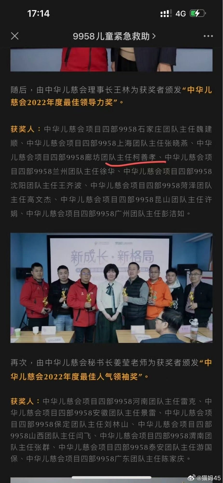 但對這份聲明,被騙家屬們并不認(rèn)同。首先是涉案人員柯某孝的身份問題,此前中華兒慈會官方公眾號顯示,柯某孝為“中華兒慈會項(xiàng)目四部9958廊坊團(tuán)隊(duì)主任”,獲“中華兒慈會2022年度最佳領(lǐng)導(dǎo)力獎”。目前,中華兒慈會官方公眾號文章已對這些內(nèi)容進(jìn)行修改或刪除。