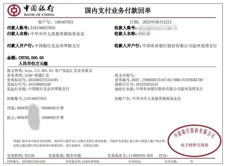 一位患者家屬提供給記者的銀行轉(zhuǎn)賬記錄顯示,8月22日的一張銀行的付款回單上,付款人名稱為:中華少年兒童慈善救助基金會,收款人名稱為患者家屬陳某某,單據(jù)上標(biāo)注的用途為某某某醫(yī)藥費(fèi)等字樣。收款金額為5萬元。