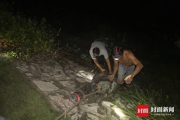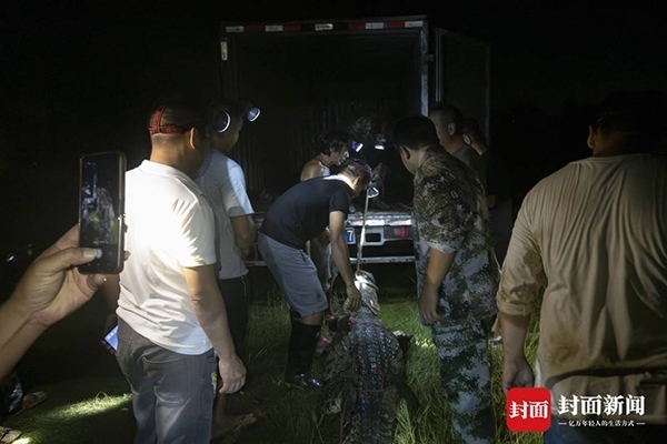 9月16日深夜,封面新聞記者從廣東茂名茂南區(qū)“出逃”暹羅鱷抓捕現場獲悉,當夜有3條暹羅鱷被專業(yè)人員從養(yǎng)殖場外的水域中抓捕上岸。9月11日,茂南區(qū)一鱷魚養(yǎng)殖場因洪水沖塌圍墻造成部分鱷魚“出逃”,經過連續(xù)6天的搜尋,截至16日24時,養(yǎng)殖場中原養(yǎng)殖的71條暹羅鱷已有69條被抓獲,僅剩2條仍在搜尋。