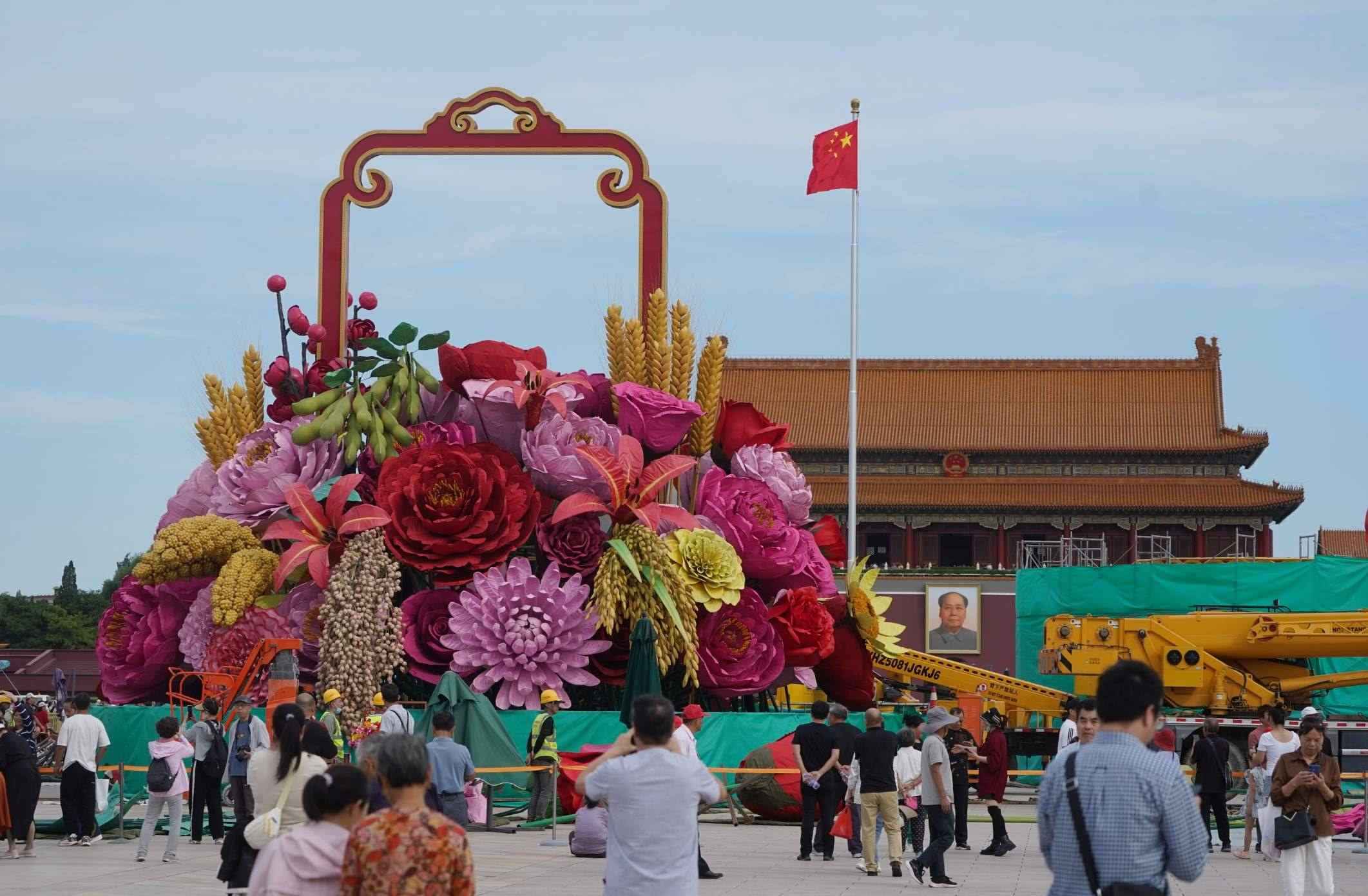 今年,天安門廣場(chǎng)中心的“祝福祖國”主題花壇以喜慶的花籃為主景?;@內(nèi)選取了擁有美好寓意的花卉和喜慶豐收的五谷(水稻、小麥、小米、黃米、大豆),體現(xiàn)花團(tuán)錦簇、五谷豐登。