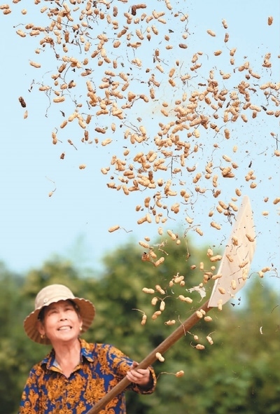 山東省棗莊市市中區(qū)稅郭鎮(zhèn)沙溝村,農民在揚曬花生。 孫中喆攝(人民視覺) |