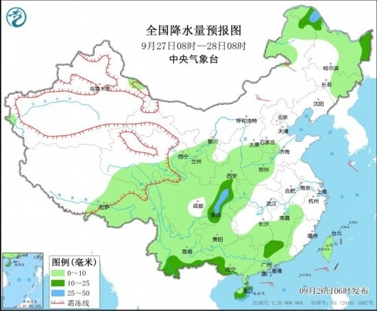 9月27日08時(shí)至28日08時(shí),內(nèi)蒙古東部、東北地區(qū)東部和北部、西藏東部、西北地區(qū)中東部、華北南部、黃淮西部、江漢西部、江南中南部、西南地區(qū)、華南、臺(tái)灣島等地部分地區(qū)有小到中雨,其中,內(nèi)蒙古東北部、黑龍江西北部、四川盆地東北部、重慶西部、海南島東北部和西南部等地部分地區(qū)有大雨。內(nèi)蒙古中部部分地區(qū)有5~6級(jí)風(fēng)。