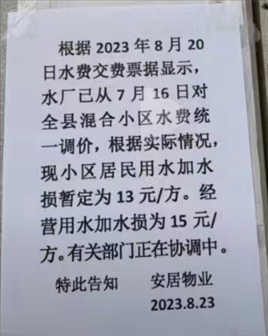 上述網(wǎng)民在《民生熱線》上投訴:“白水縣全縣小區(qū)水費(fèi)上調(diào),最少的12.6元/方,還有15元/方,以前需7元/方,為什么翻倍漲價?”同時,該網(wǎng)民還列出兩張自來水價格調(diào)整的通知。