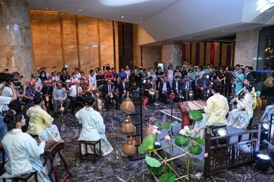 9月29日,嘉賓們在亞奧理事會(huì)大家庭總部飯店活動(dòng)現(xiàn)場欣賞江南絲竹《水鄉(xiāng)蓮韻》表演。新華社記者 陳曄華 攝