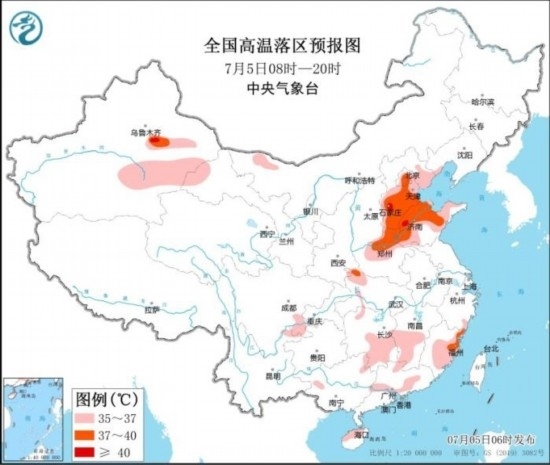 預(yù)計7月5日白天,河北中南部和東北部、北京大部、天津、山東大部、河南中北部及湖南中南部、江西中南部、福建中東部、廣東中部、新疆南疆盆地東部等地有35℃以上高溫天氣,其中,河北中南部、北京東部、天津南部、山東中北部、河南北部等地部分地區(qū)最高氣溫37~39℃,局地可達40℃以上。中央氣象臺7月5日06時繼續(xù)發(fā)布高溫黃色預(yù)警。